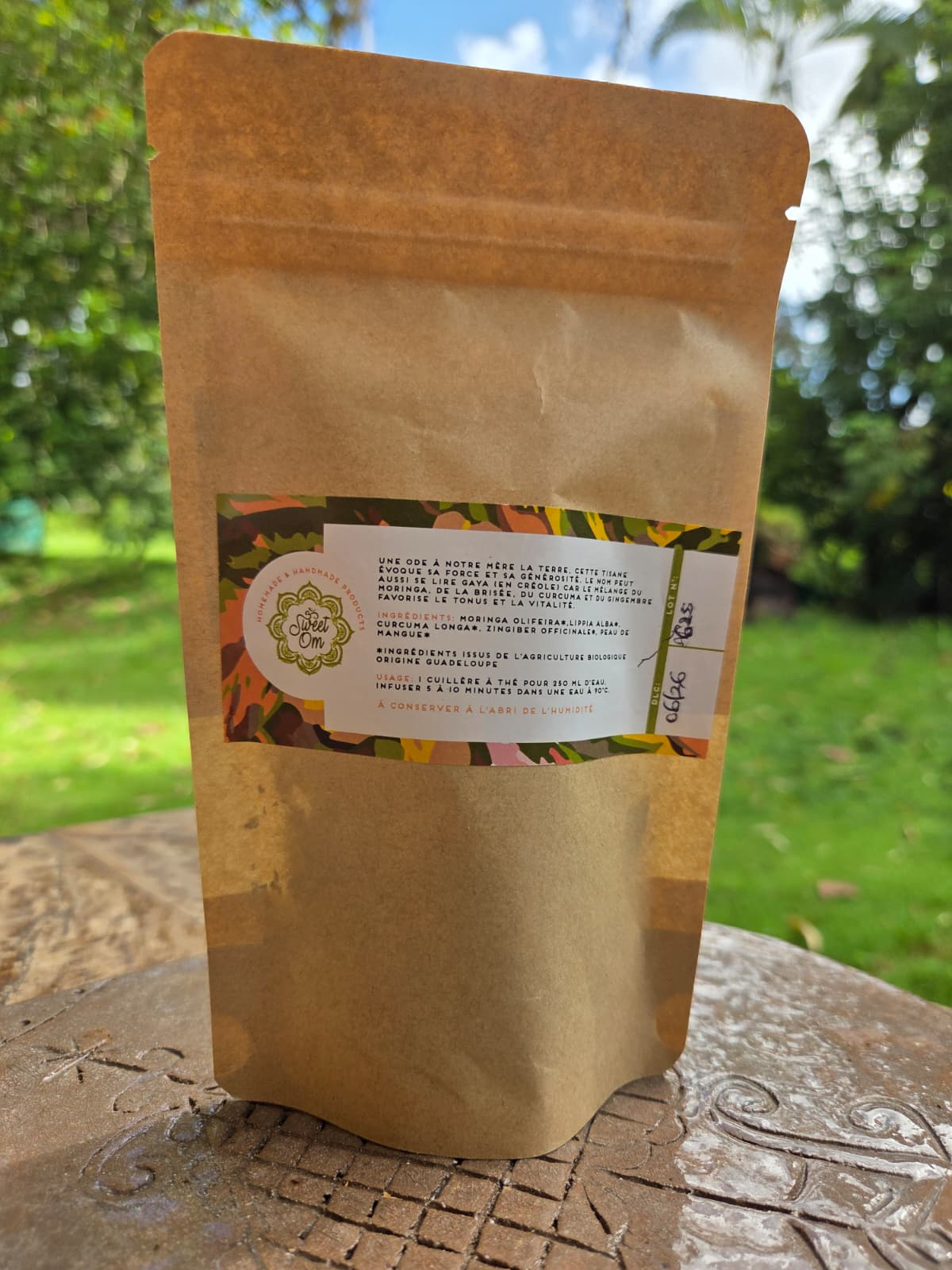 Cette infusion riche et parfumée favorise le tonus et la vitalité en associant les qualités et saveurs du curcuma, du moringa, de la twa tas, du gingembre et de la pelure de mangue.